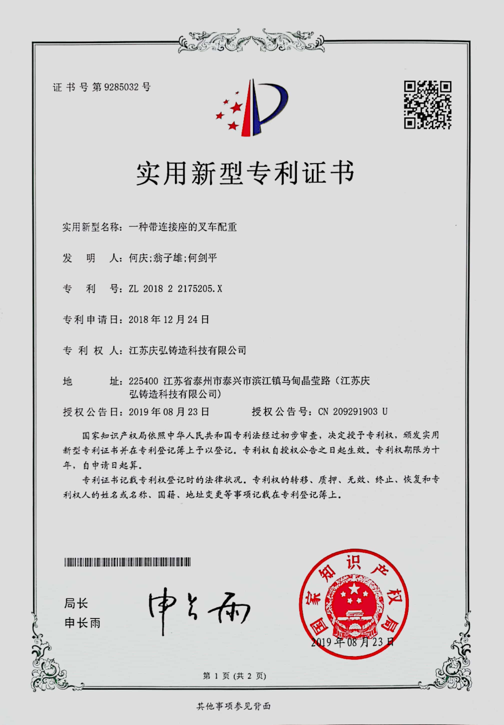 欢迎来电定制:实用新型专利证书(一种带连接座的叉车配重)