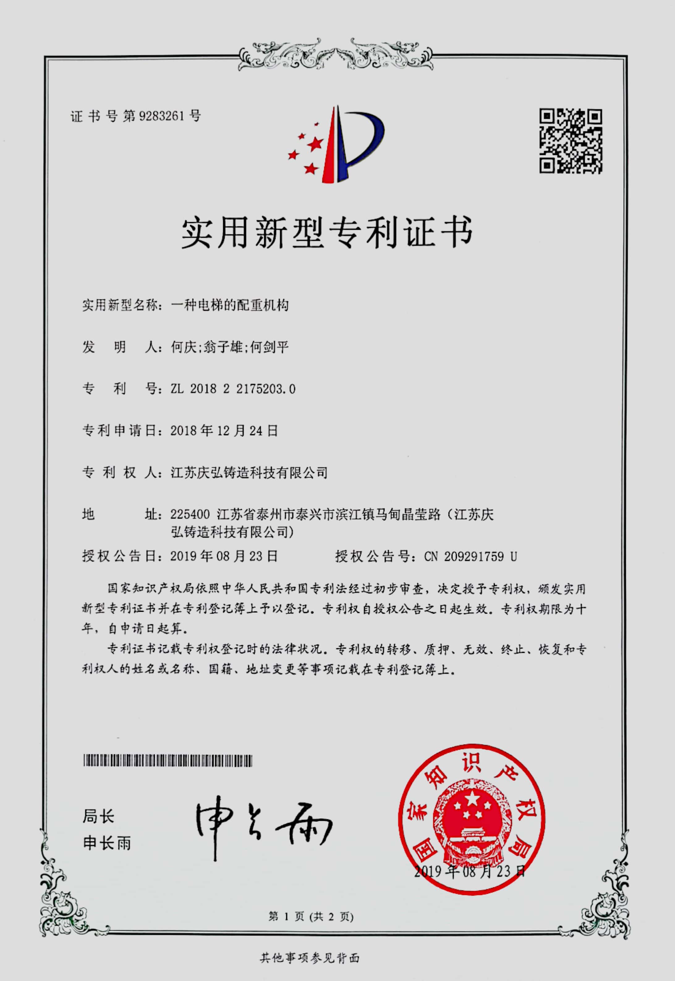 欢迎来电定制:实用新型专利证书(一种电梯的配重机构)
