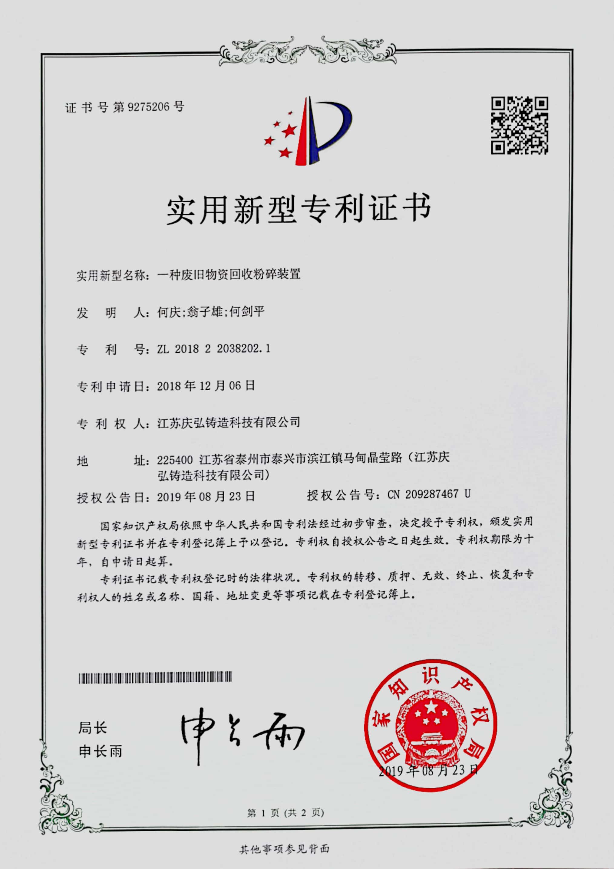 欢迎来电定制:实用新型专利证书(一种废旧物资回收粉碎装置)