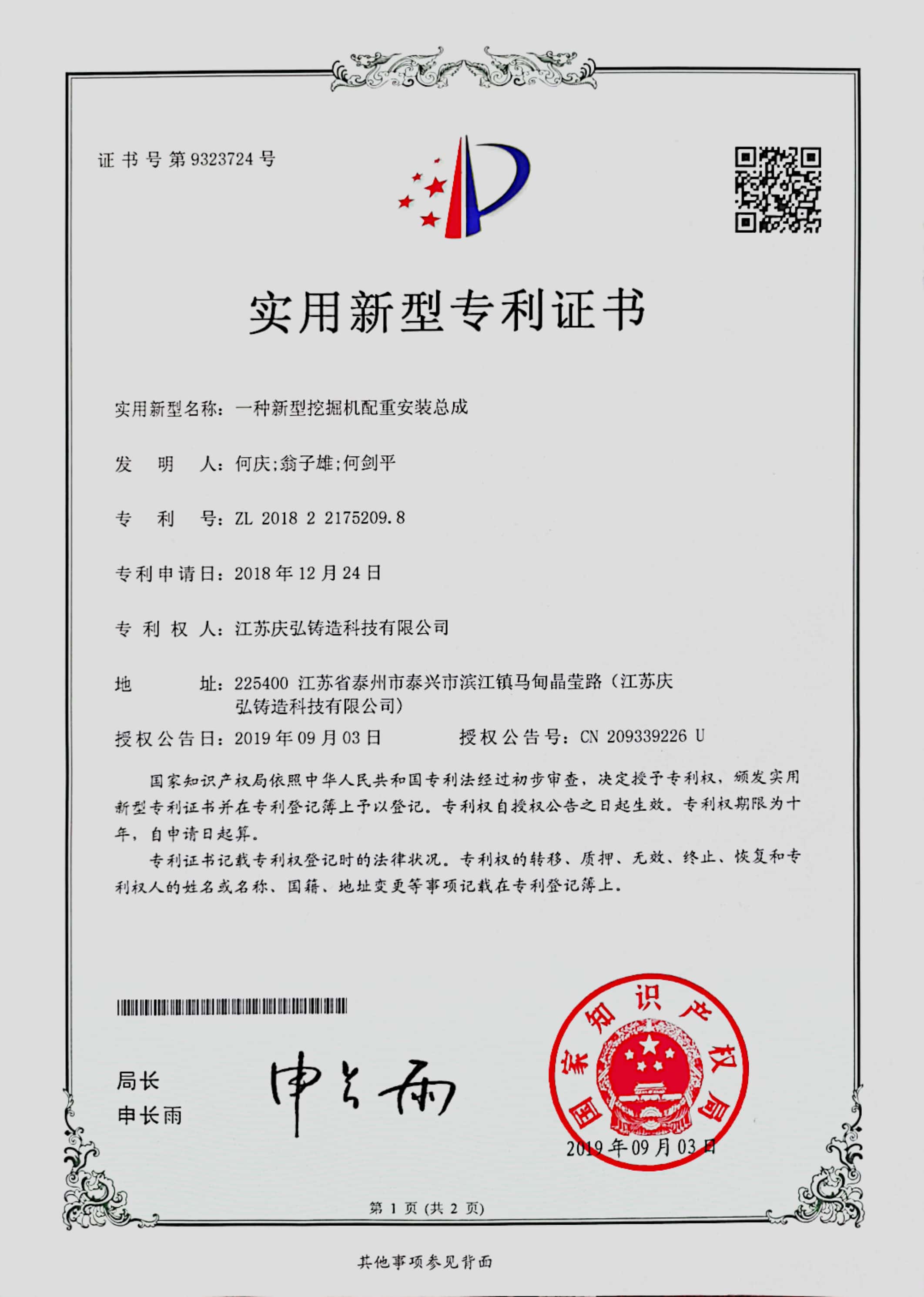欢迎来电定制:实用新型专利证书(一种新型挖掘机配重安装总成)